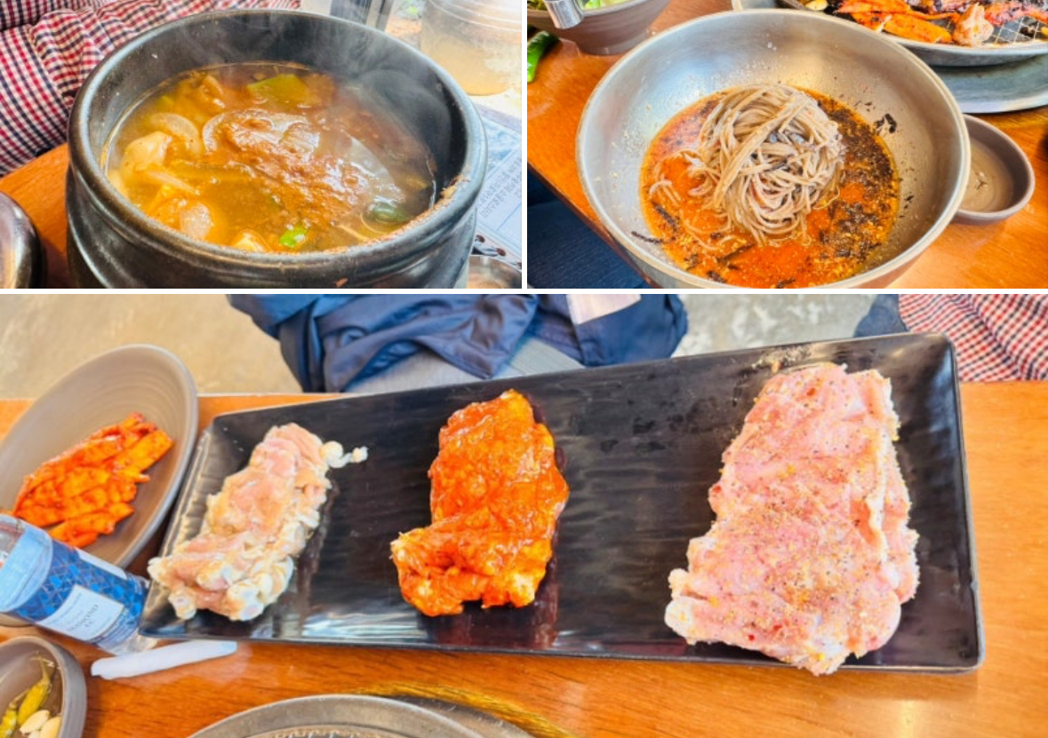 소금, 간장, 고추장 양념으로 준비된 닭갈비와 더덕구이, 막국수, 된장찌개, 공기밥이 포함된 알찬 구성이에요.