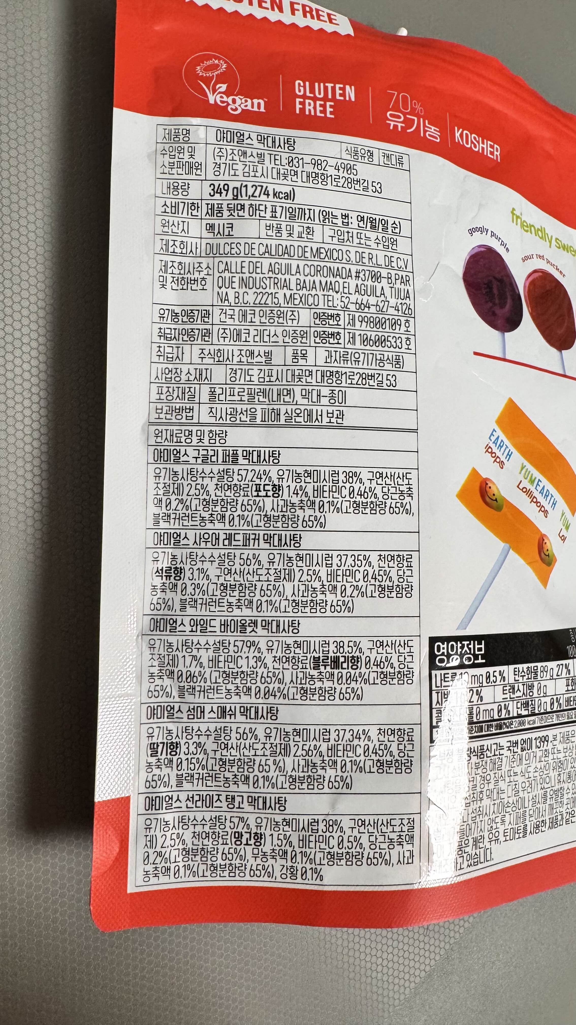 • 제품명: 야미얼스 유기농 막대사탕 패밀리팩
