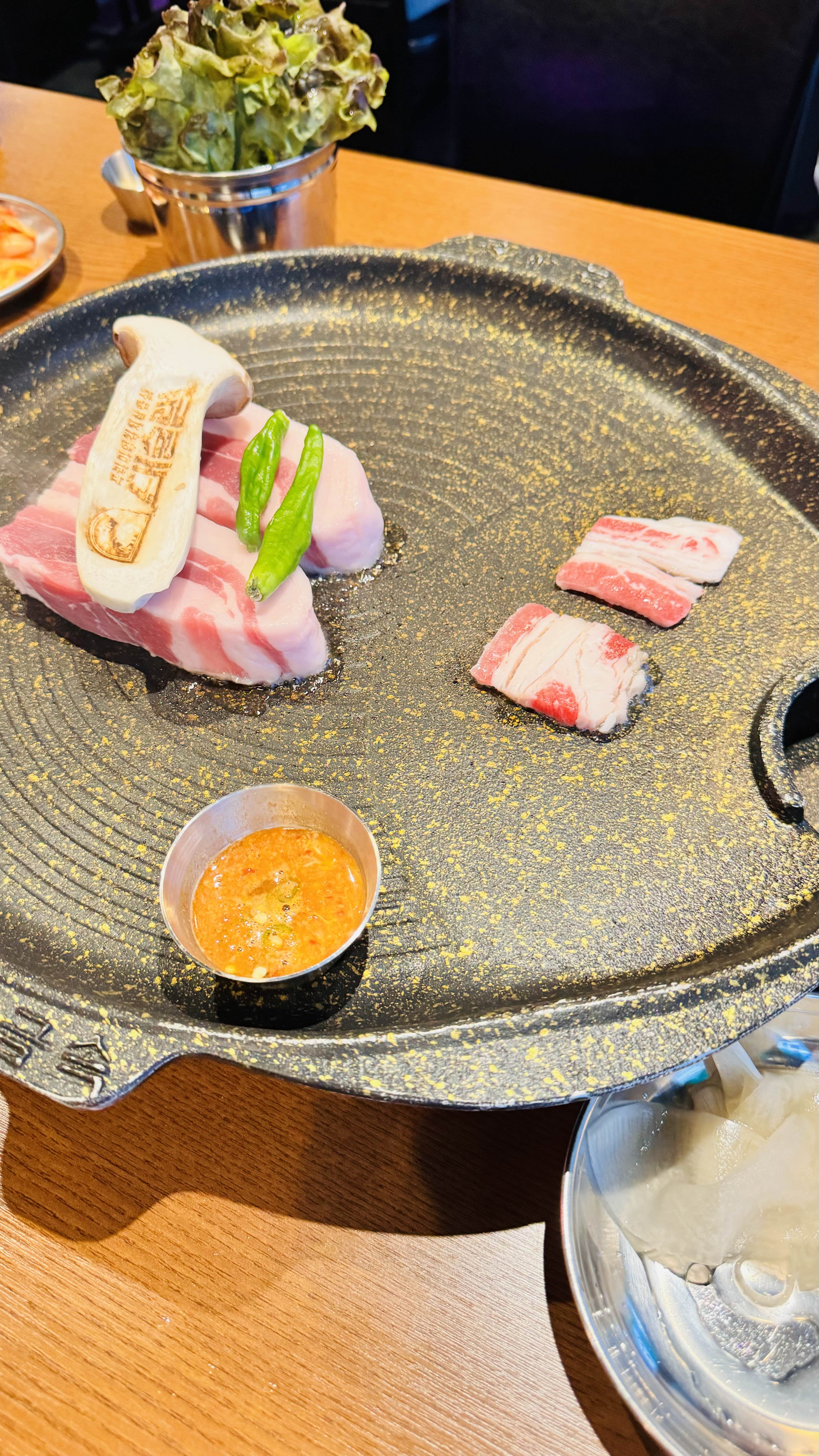 뜨겁게 달궈진 돌판 위에서 노릇노릇 구워지는 삼겹살은 정말 먹음직스러웠어요.