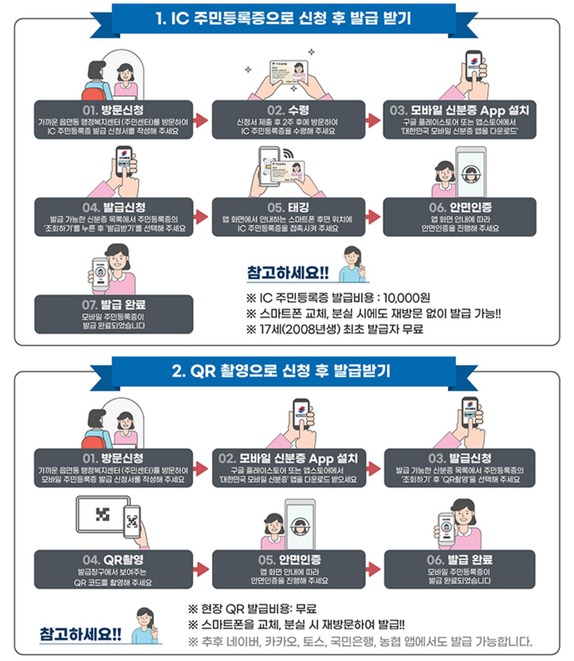 ✅ 주민센터 방문 → 신원 확인 후 IC칩이 내장된 주민등록증을 스마트폰에 접촉 → 발급 완료